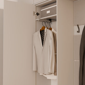 Dank ihrer modularen Konstruktion vereint Gerhard Single drei praktische Bereiche in einem harmonischen Möbelstück: eine untere Schuhablage, eine große Hauptgarderobe mit Kleiderstange sowie eine obere Staufläche für selten genutzte Accessoires oder Saisonartikel. Diese klare, vertikale Gliederung sorgt für Übersicht und ermöglicht es, selbst in kleinen Fluren maximalen Stauraum zu schaffen.