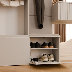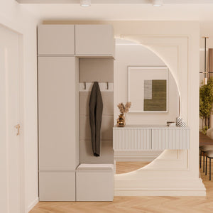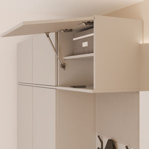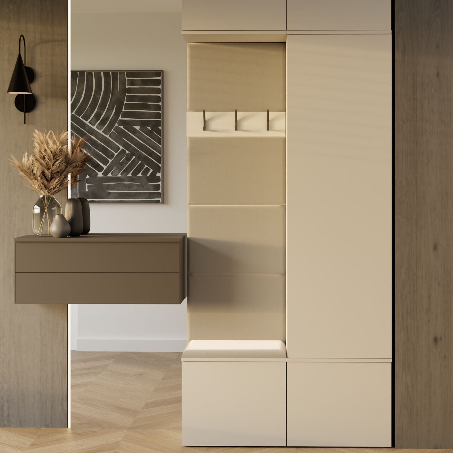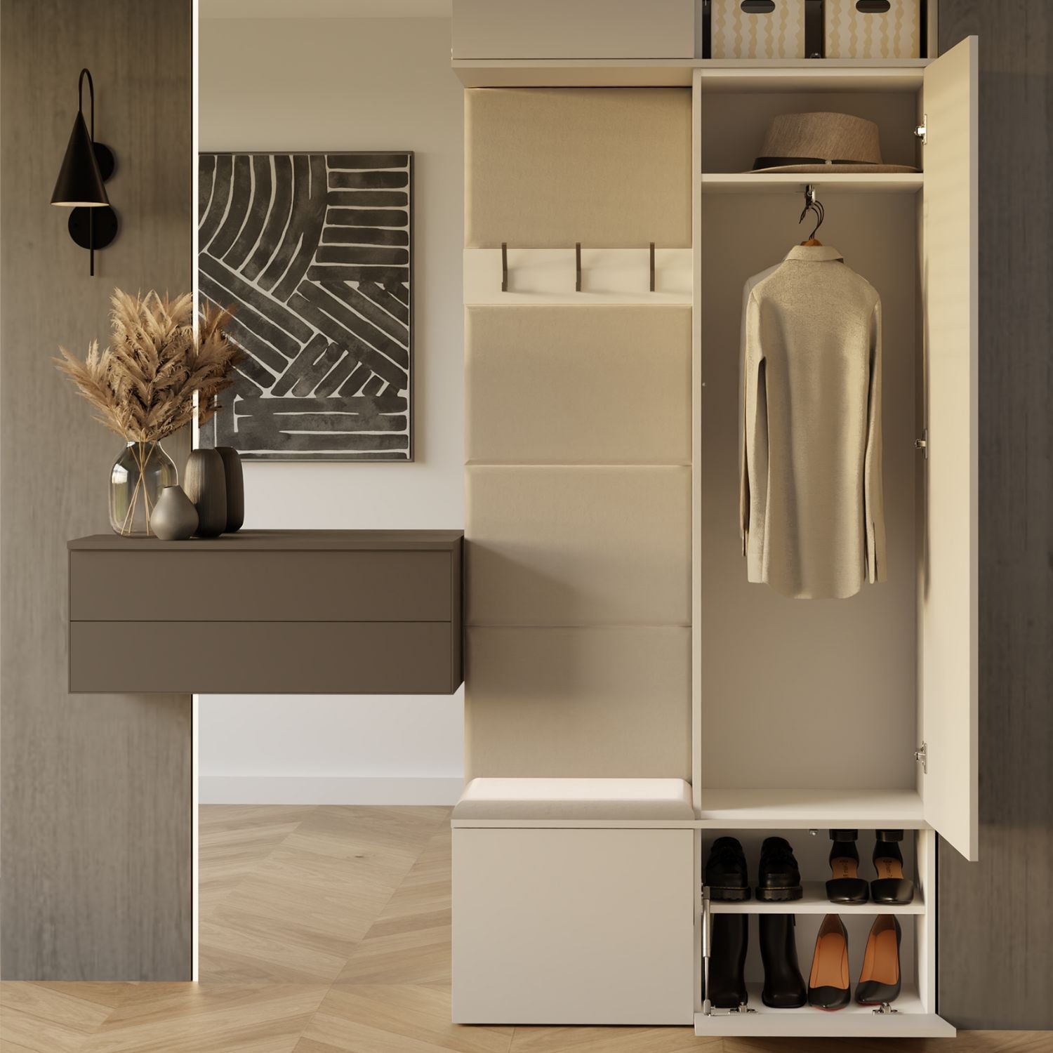 Die Garderobe Gerhard Single vereint durchdachte Funktionalität mit modernem Design und ist die ideale Lösung für kompakte, aber anspruchsvoll eingerichtete Flure. In elegantem Kaschmir-Beige gehalten, bringt sie Wärme, Stil und Struktur in den Eingangsbereich – perfekt für alle, die Wert auf eine wohnliche Atmosphäre und clevere Raumnutzung legen.