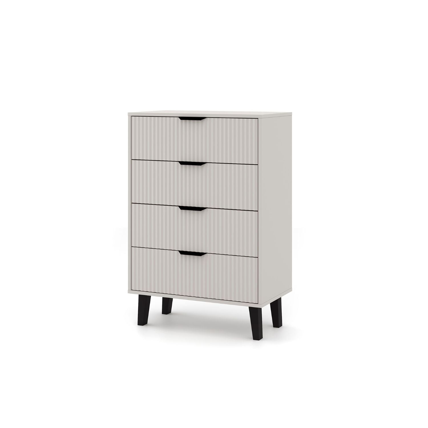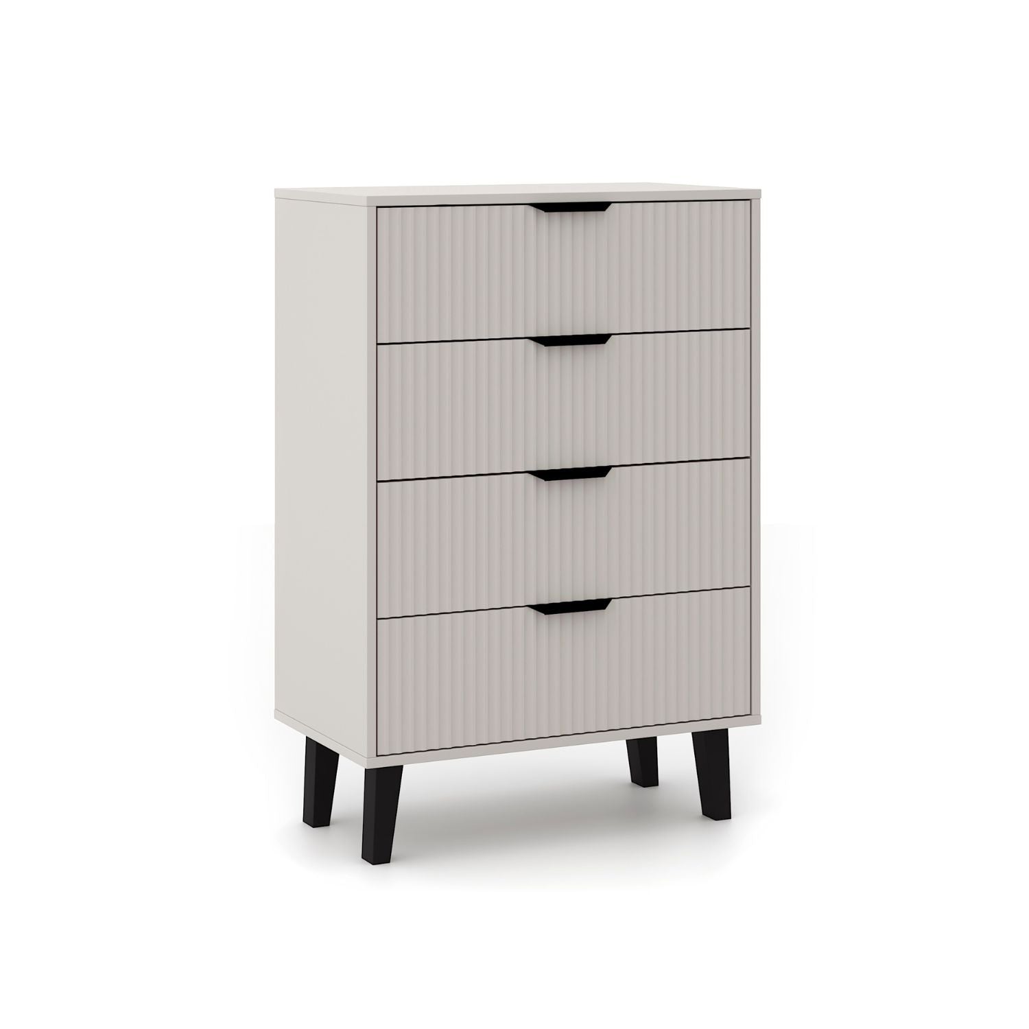 Die Kommode Kamo SCANDI 4S Slim ist die perfekte Wahl für alle, die modernes Design, Funktionalität und nordische Eleganz miteinander verbinden möchten. Mit ihren raffiniert strukturierten Fronten, praktischen Schubladen und den kontrastierenden schwarzen Details wird sie zum stilvollen Highlight in jedem Raum – kompakt, elegant und vielseitig einsetzbar.