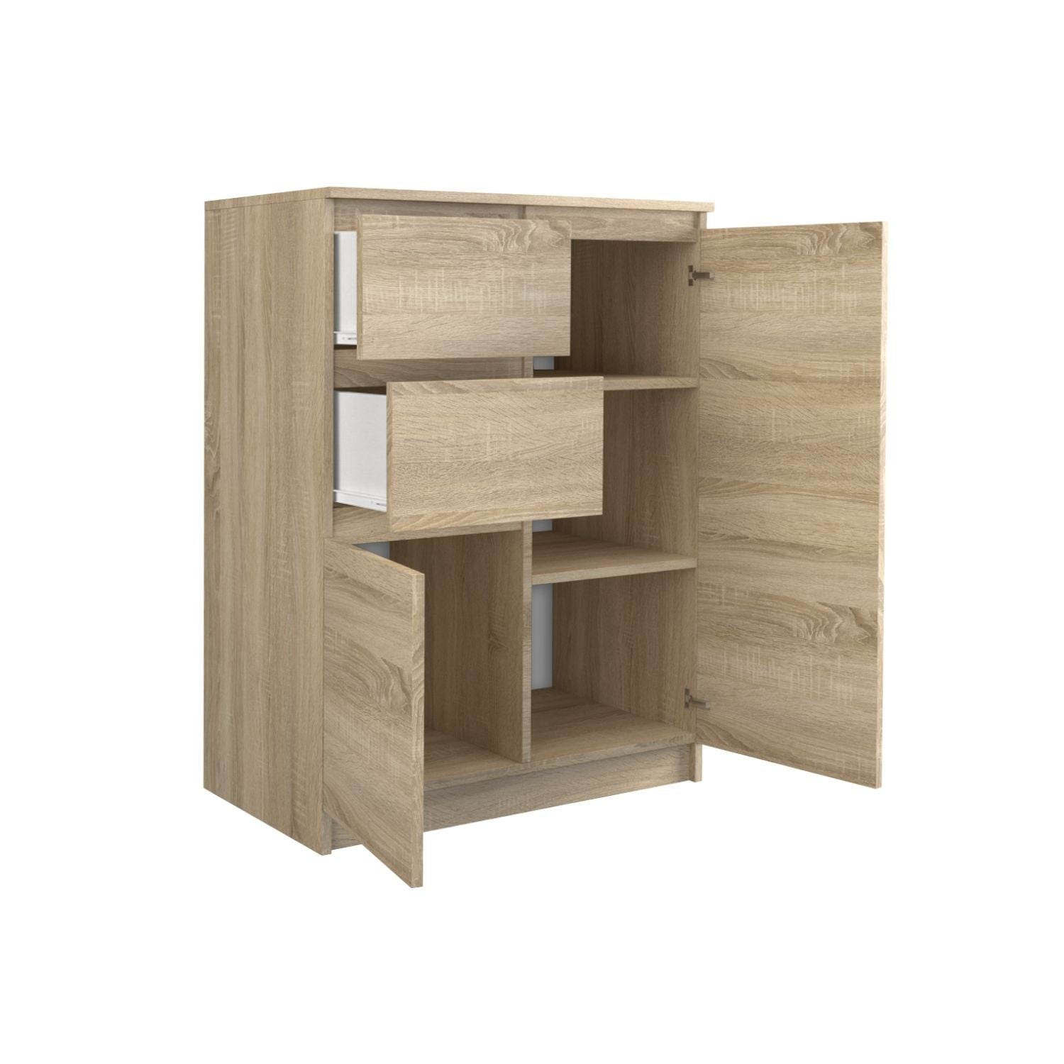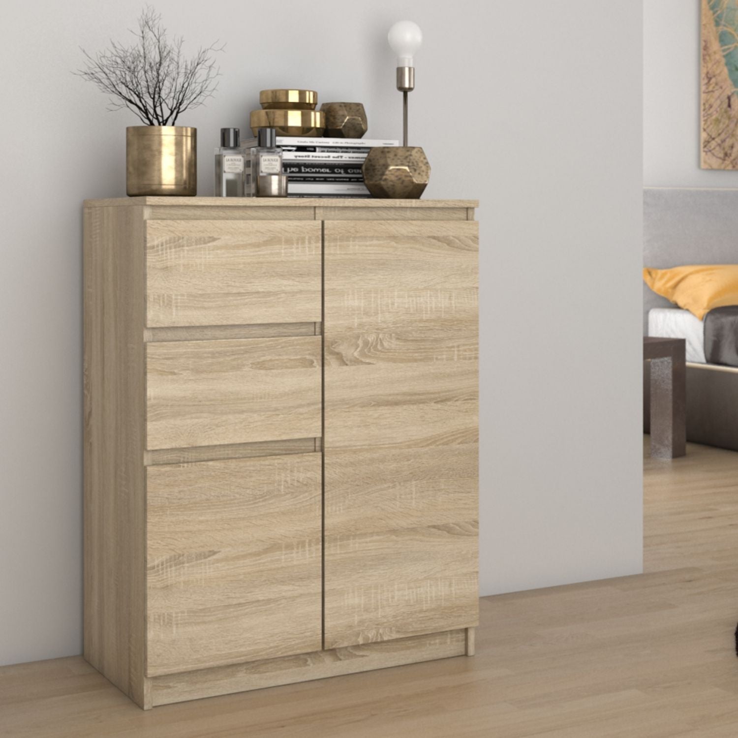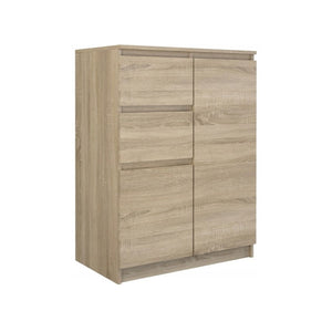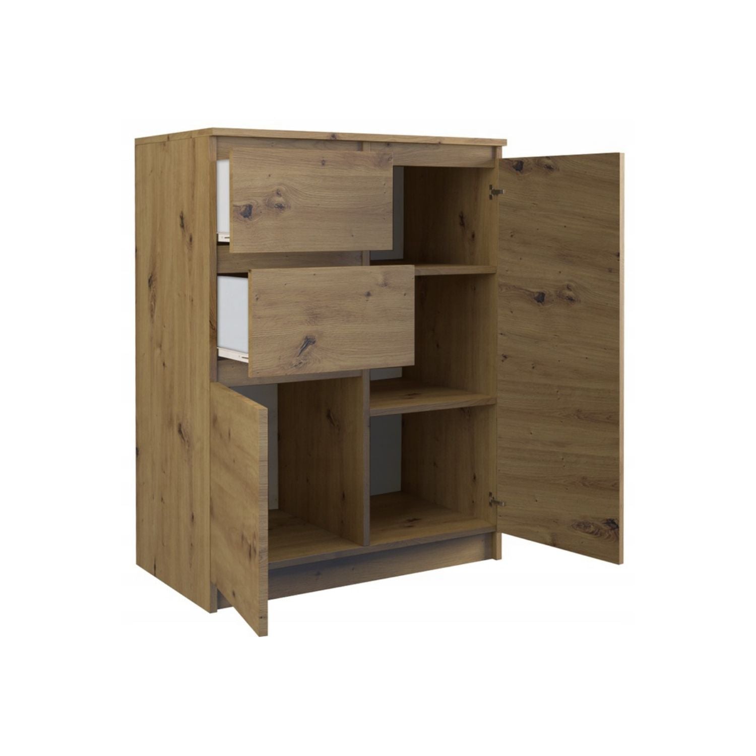 Mit zwei Türen und zwei leichtgängigen Schubladen bietet die Kommode Kelly ein durchdachtes Stauraumkonzept, das Ordnung in Schlafzimmer, Wohnzimmer, Flur oder Kinderzimmer schafft. Hinter den Türen befinden sich praktische Ablagefächer, ideal für Kleidung, Dokumente, Haushaltsutensilien oder Spielzeug. Die beiden Schubladen unterstützen eine besonders übersichtliche Organisation kleinerer Gegenstände.