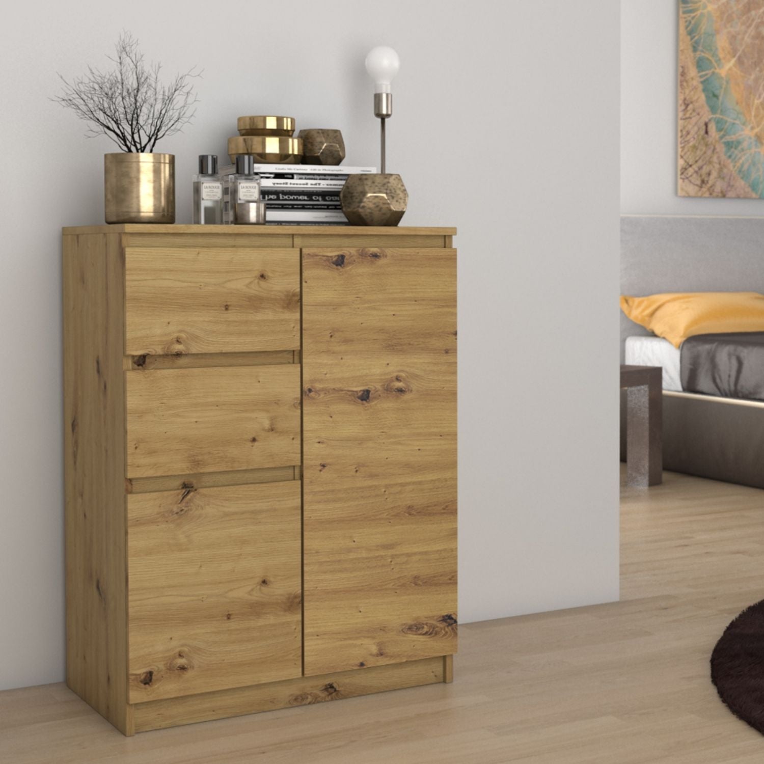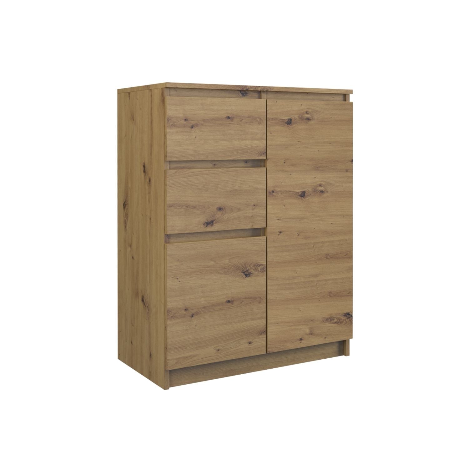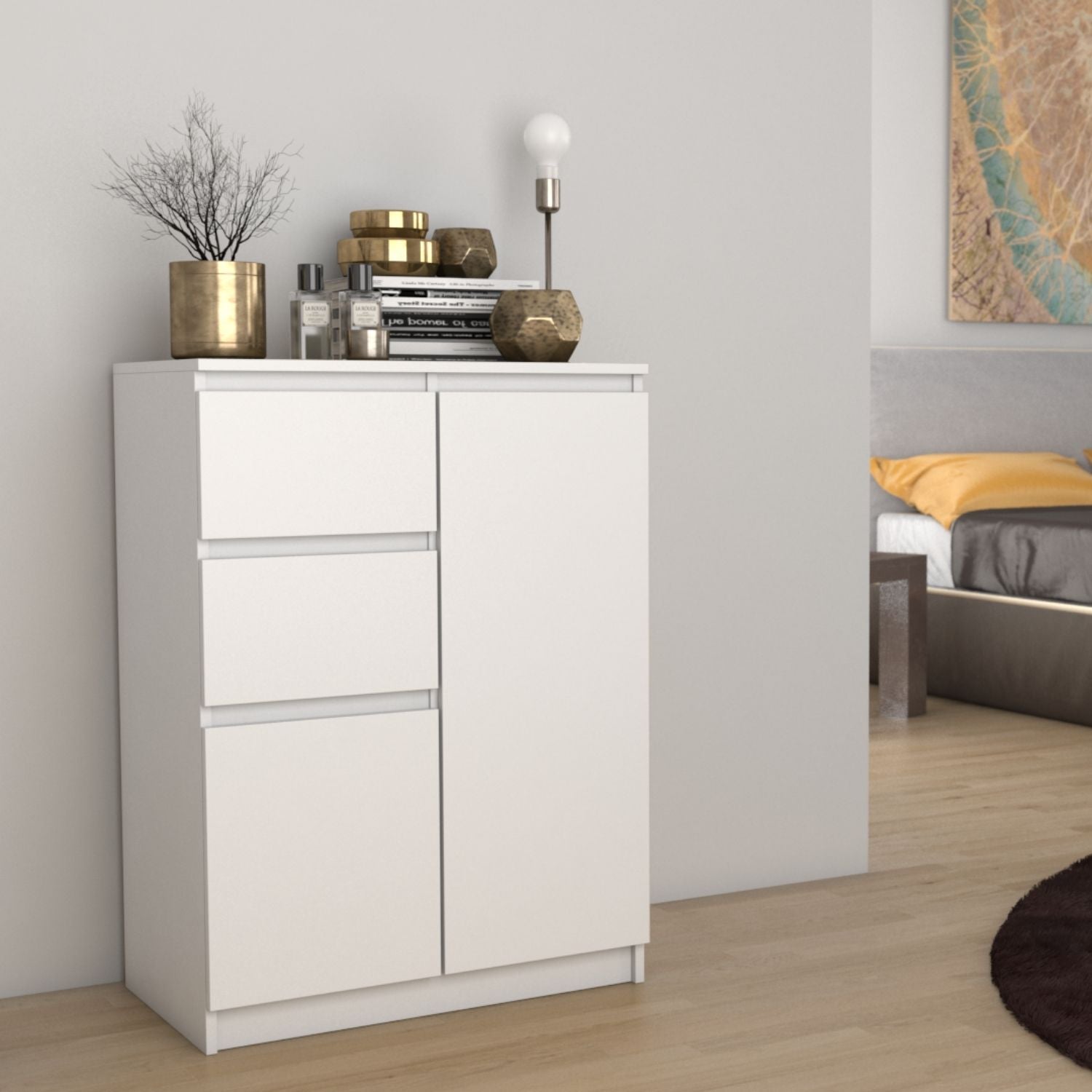 Mit zwei Türen und zwei leichtgängigen Schubladen bietet die Kommode Kelly ein durchdachtes Stauraumkonzept, das Ordnung in Schlafzimmer, Wohnzimmer, Flur oder Kinderzimmer schafft. Hinter den Türen befinden sich praktische Ablagefächer, ideal für Kleidung, Dokumente, Haushaltsutensilien oder Spielzeug. Die beiden Schubladen unterstützen eine besonders übersichtliche Organisation kleinerer Gegenstände.