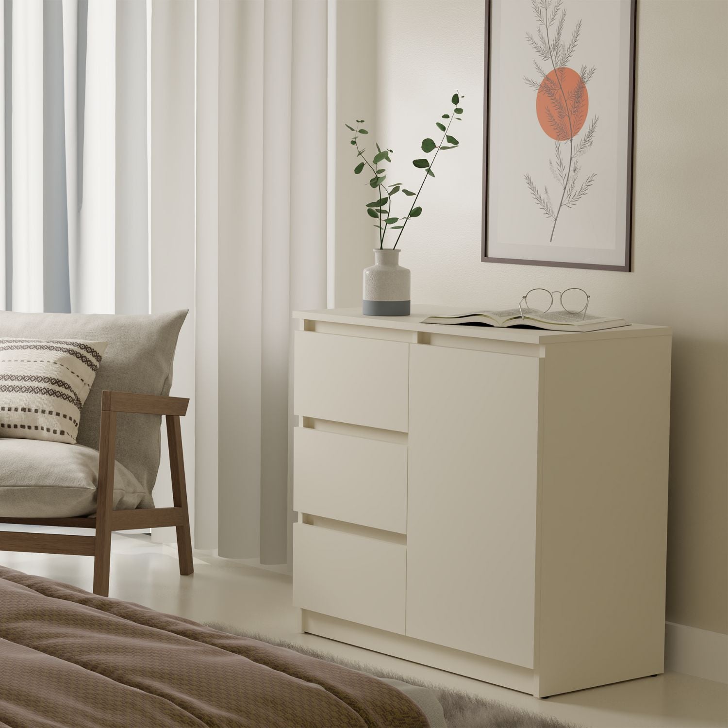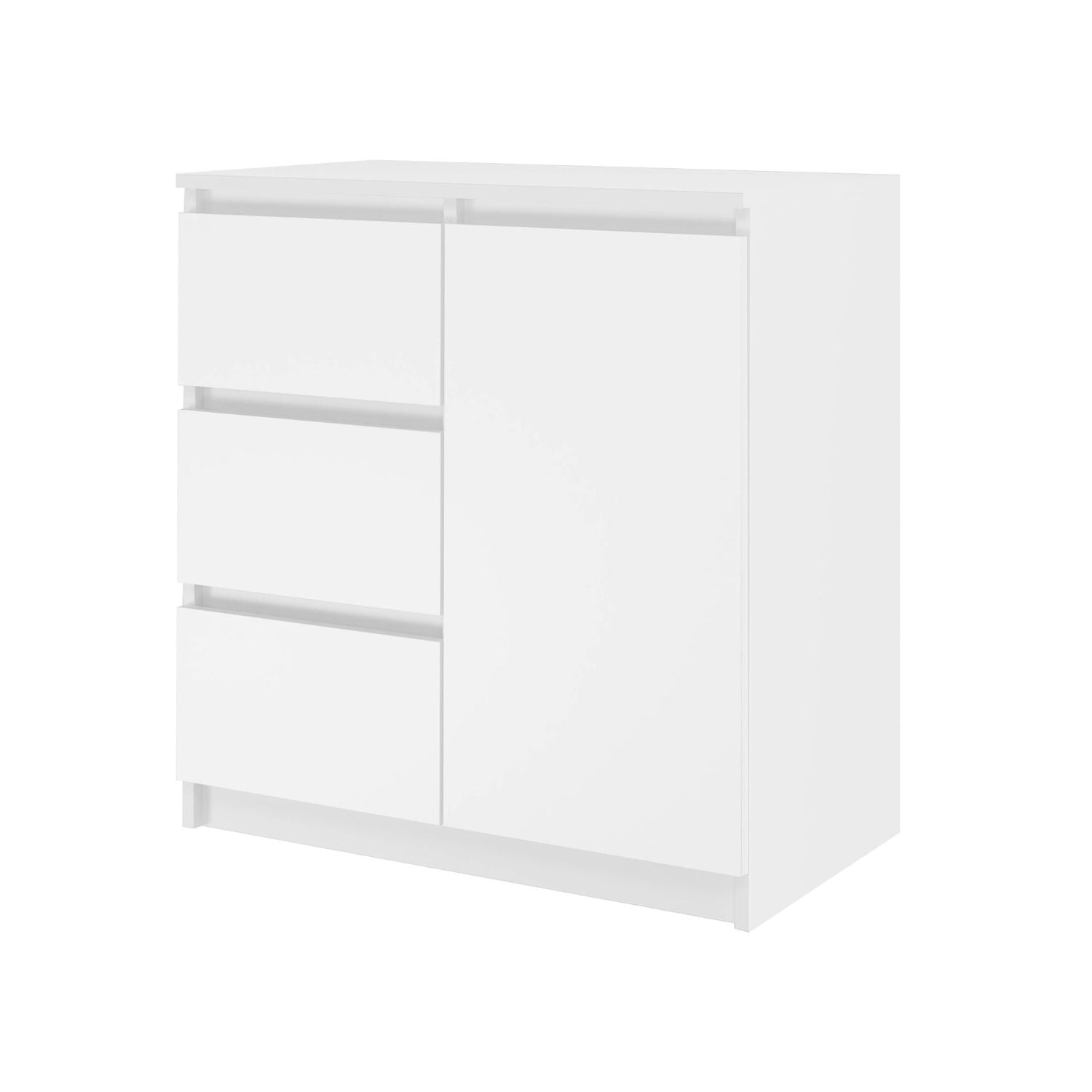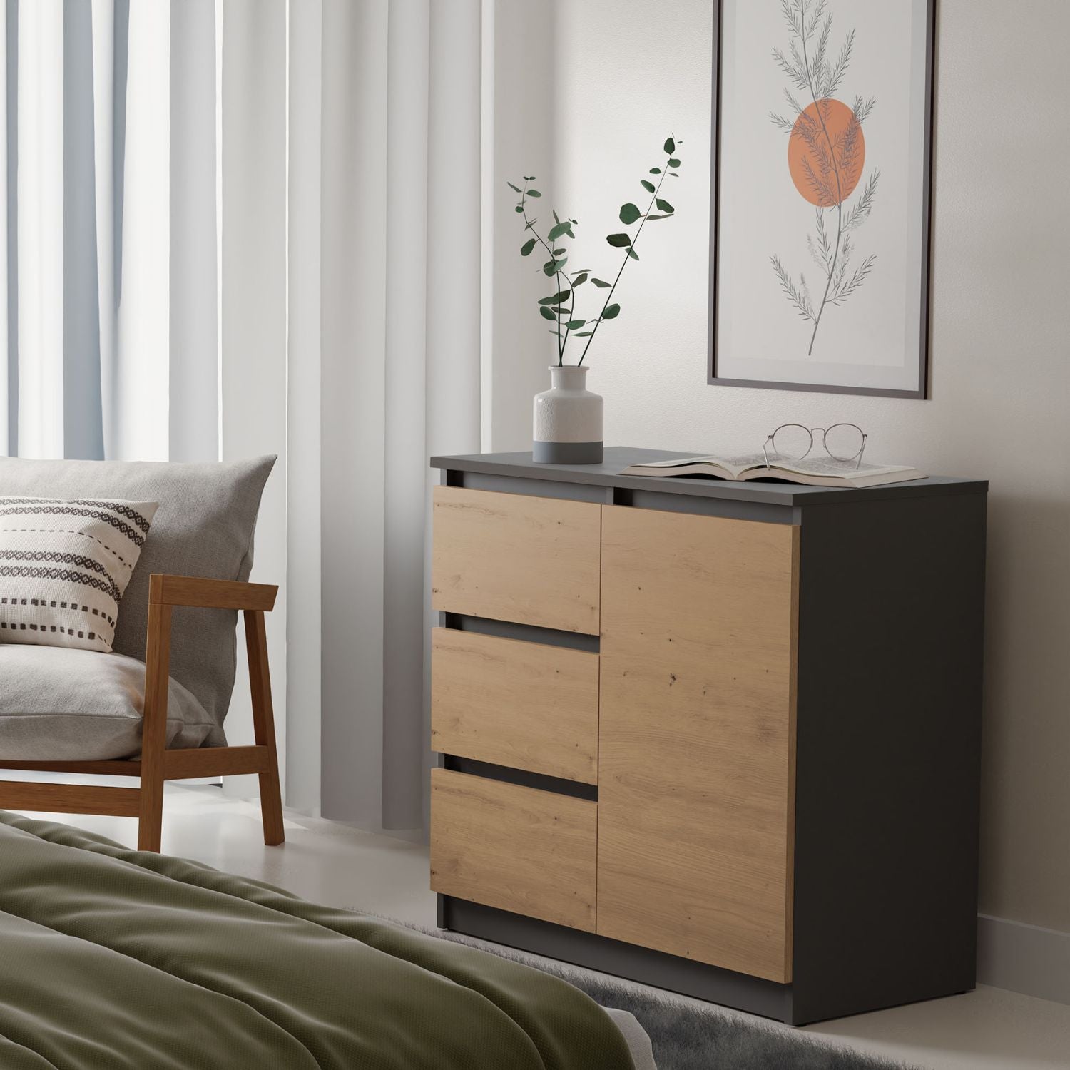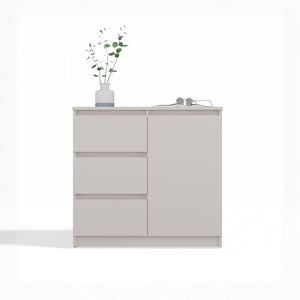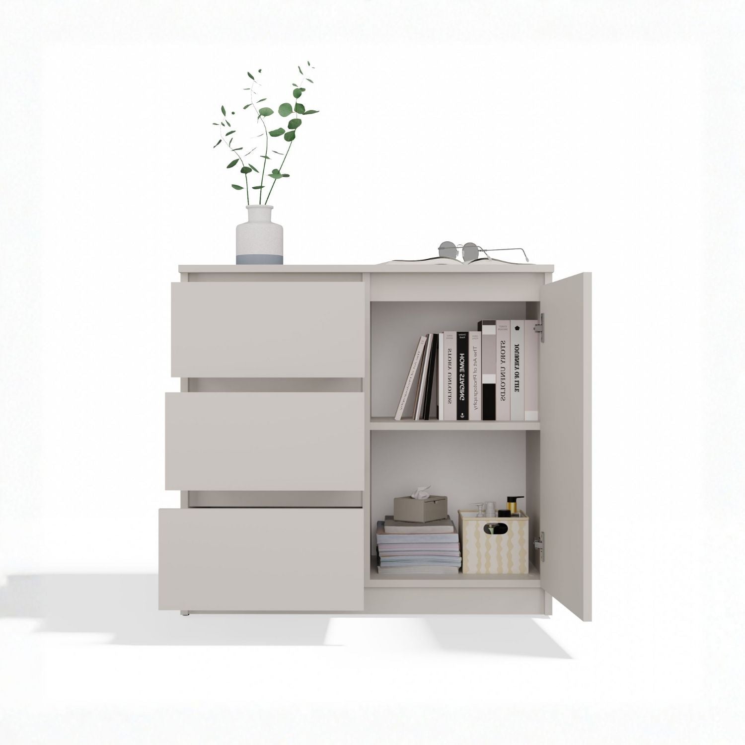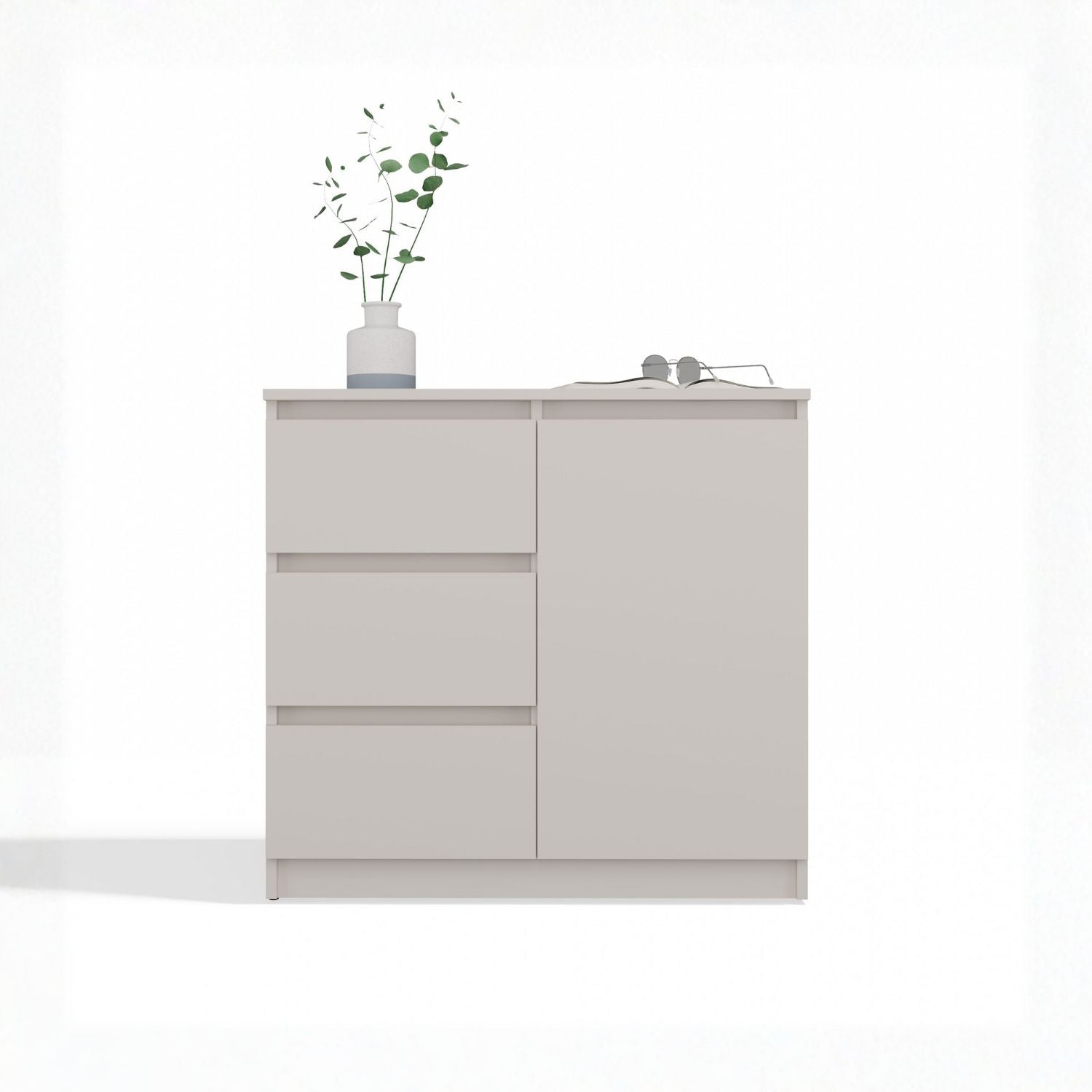 Die Kommode Milo vereint moderne Linienführung, zeitlose Eleganz und funktionale Aufteilung in einem vielseitigen Möbelstück. Mit einer Kombination aus einer Tür und drei geräumigen Schubladen bietet sie ausreichend Stauraum für Kleidung, Dokumente, Accessoires oder Alltagsgegenstände – perfekt für Schlafzimmer, Wohnzimmer, Flur oder Kinderzimmer.