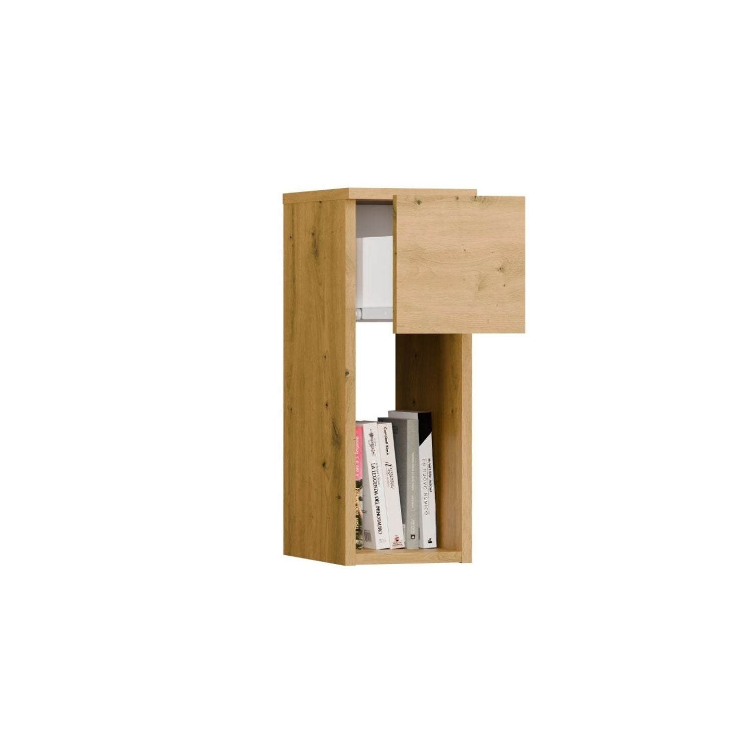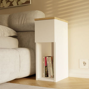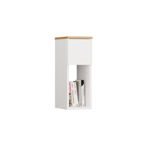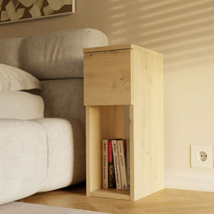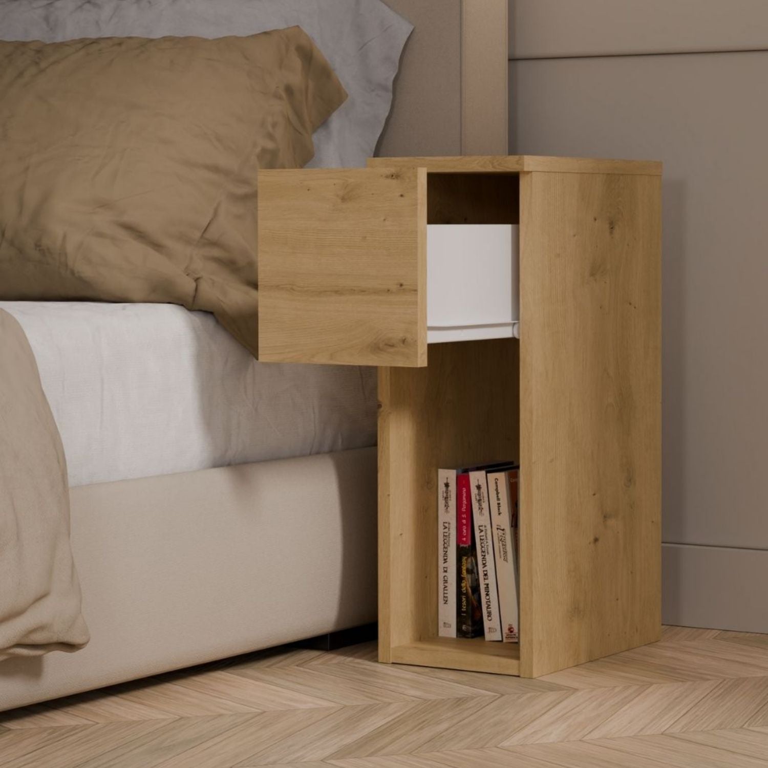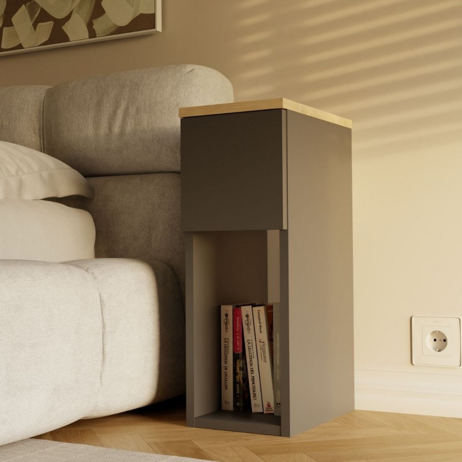 Der Nachttisch verfügt über eine offene Ablagefläche sowie eine praktische Schublade, die sich hervorragend für all jene Dinge eignet, die nachts griffbereit sein sollen – Smartphone, Buch, Brille oder Ladegerät. Der obere Ablagebereich bietet genug Platz für eine Nachttischlampe, einen Wecker oder dekorative Elemente, die dem Raum eine persönliche Note verleihen.