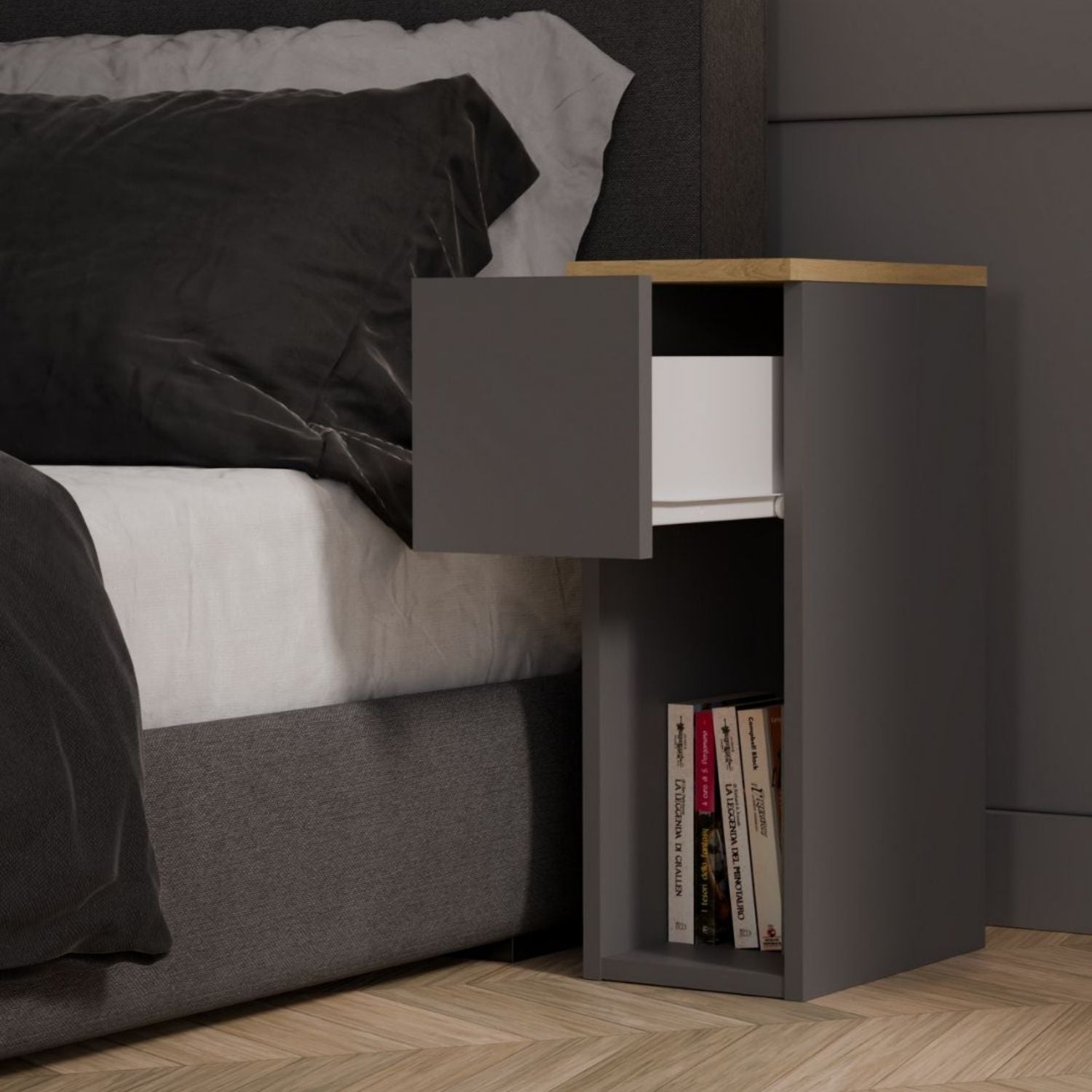 Der Nachttisch Nila kombiniert modernes Design mit praktischer Funktionalität. Er bietet eine Schublade und ein offenes Fach für die wichtigsten Dinge am Bett, überzeugt durch hochwertige Materialien und eine stilvolle Farbkombination aus Anthrazit und Eiche Artisan.