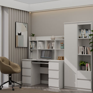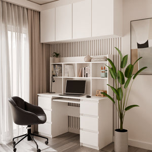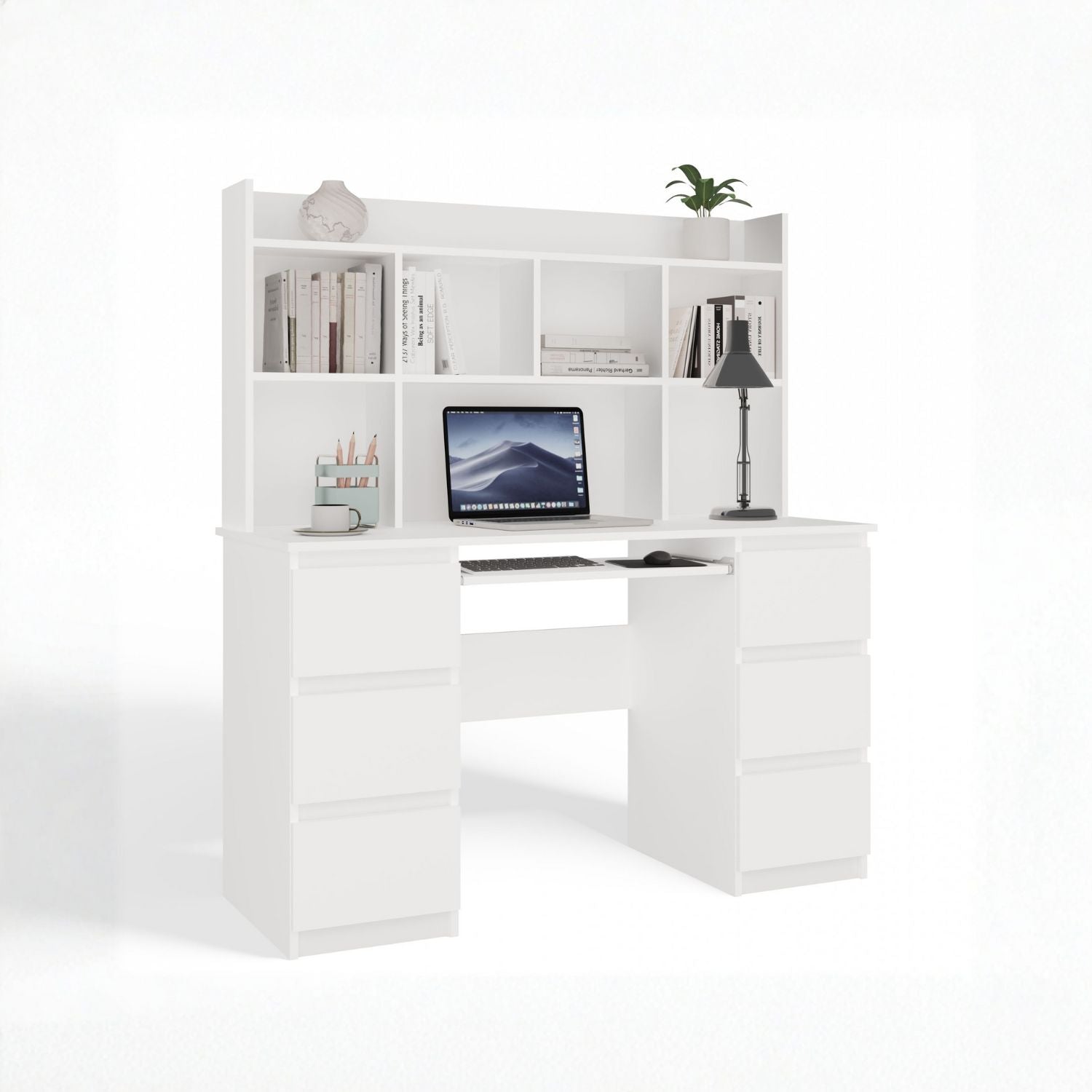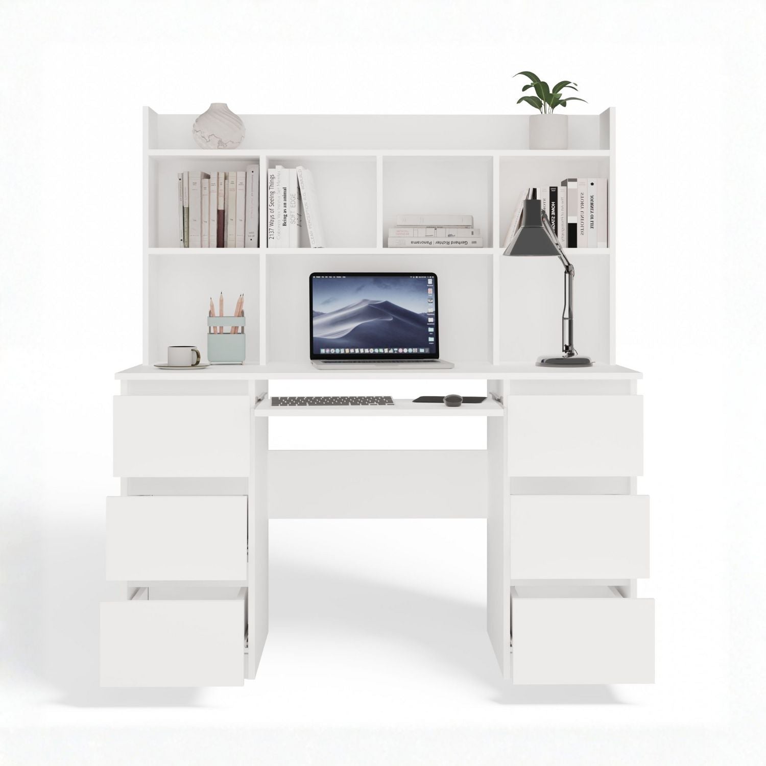 Der Schreibtisch Samo kombiniert elegantes Weiß, funktionale Aufteilung und durchdachtes Design. Mit sechs Schubladen, Tastaturauszug und Aufsatz mit fünf Fächern bietet er reichlich Stauraum und schafft eine aufgeräumte, moderne Arbeitsumgebung – perfekt für Büro, Studium oder Homeoffice.