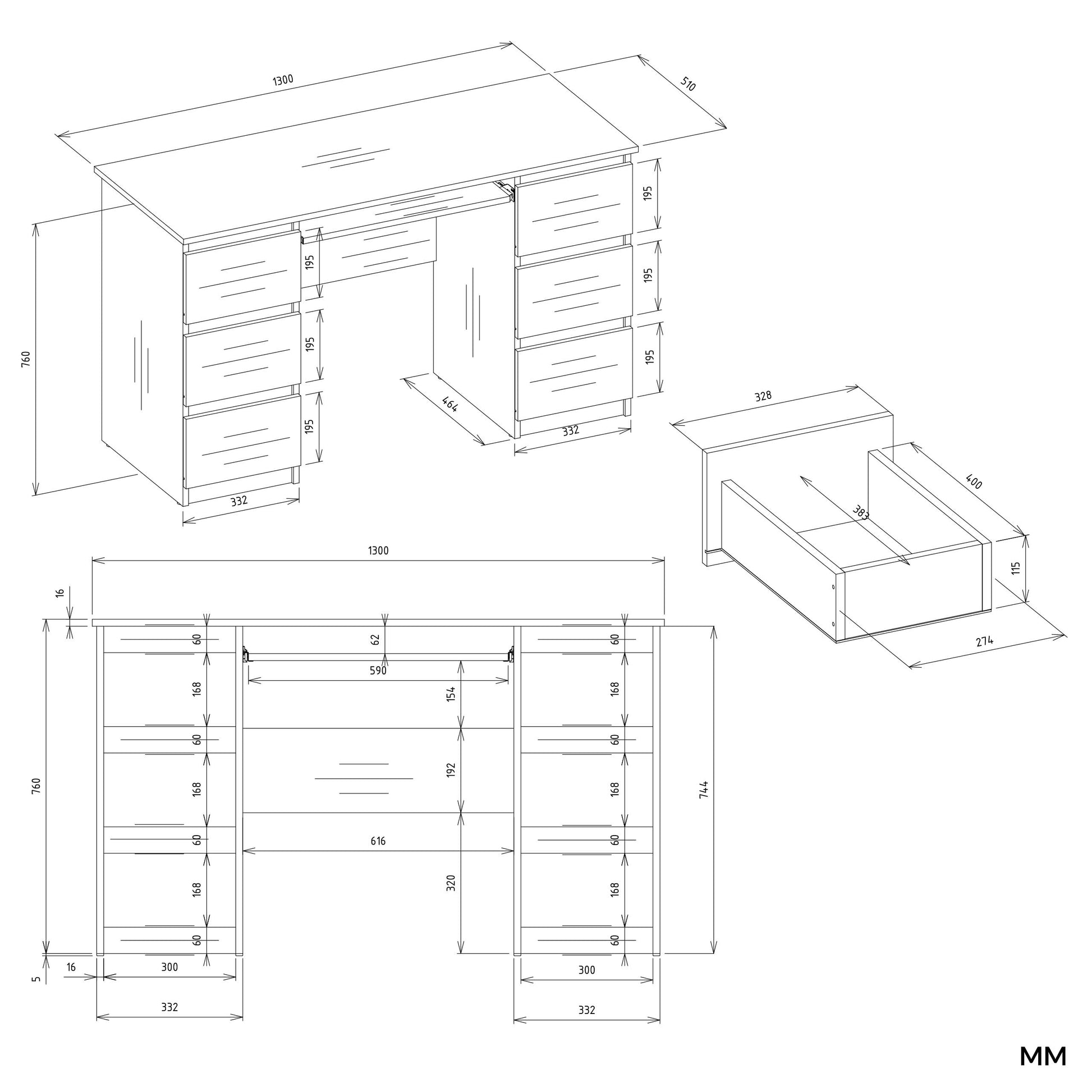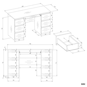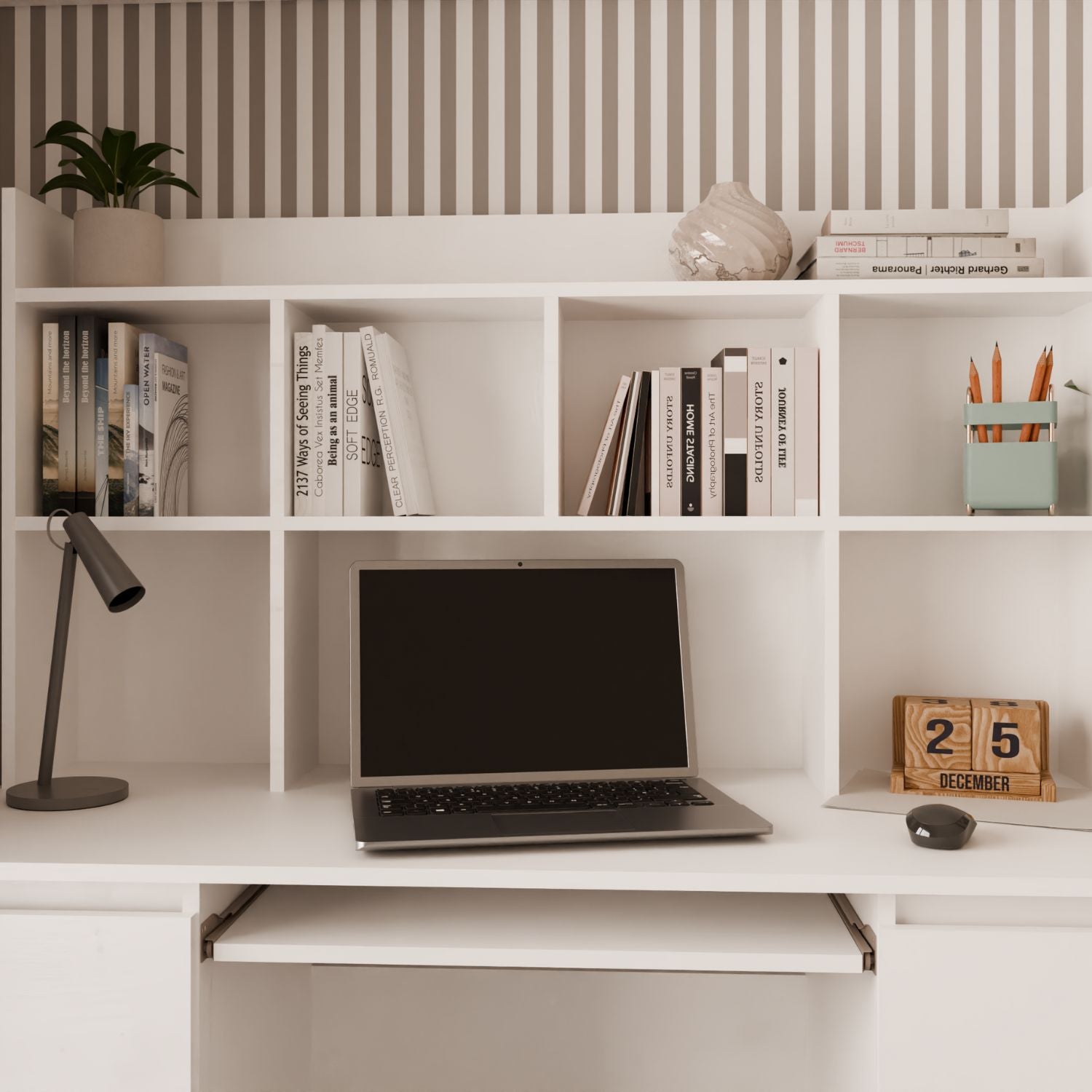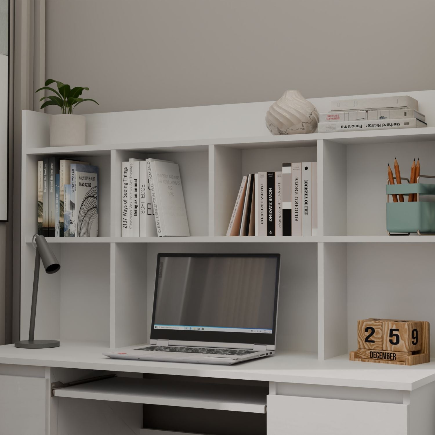 Der Schreibtisch Samo kombiniert elegantes Weiß, funktionale Aufteilung und durchdachtes Design. Mit sechs Schubladen, Tastaturauszug und Aufsatz mit fünf Fächern bietet er reichlich Stauraum und schafft eine aufgeräumte, moderne Arbeitsumgebung – perfekt für Büro, Studium oder Homeoffice.